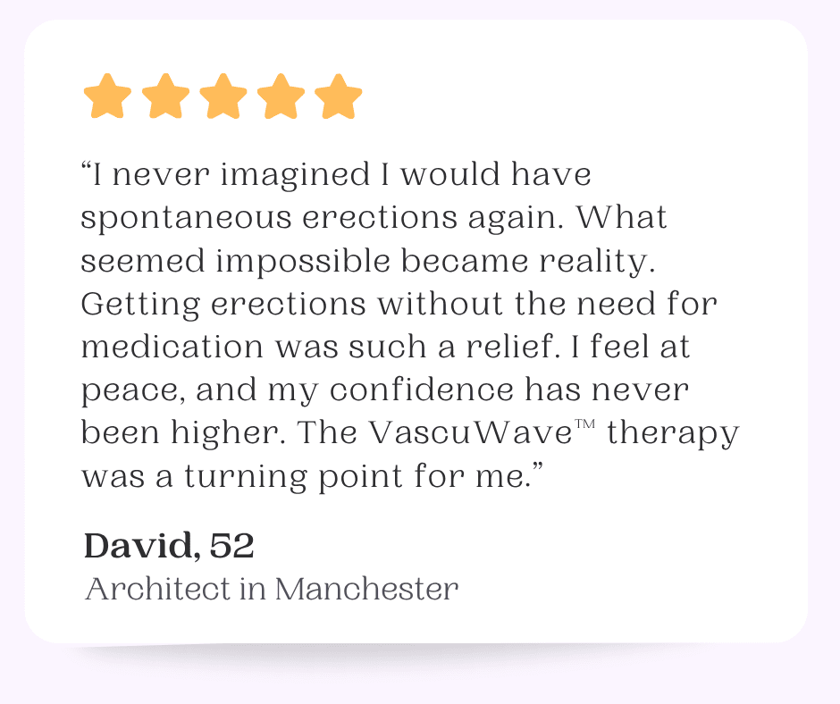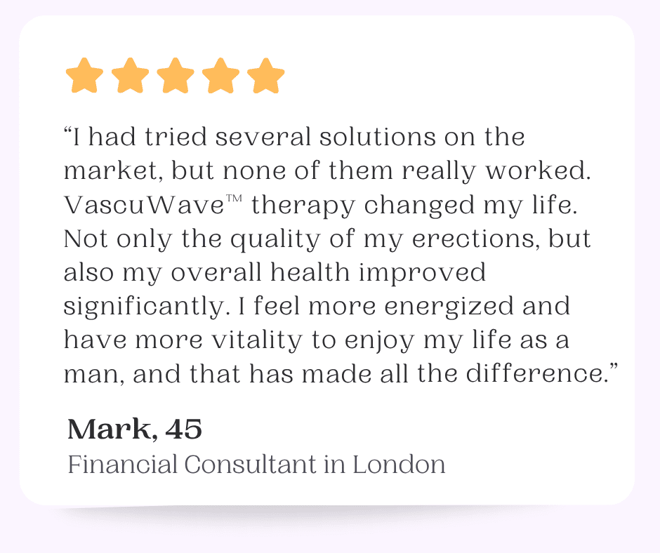 Studies from renowned institutions like University College London (2022) validate the efficacy of low-intensity shockwave therapy. Testimonials from men like David, Mark, and James confirm that the therapy not only improves erectile function but also restores confidence and quality of life.