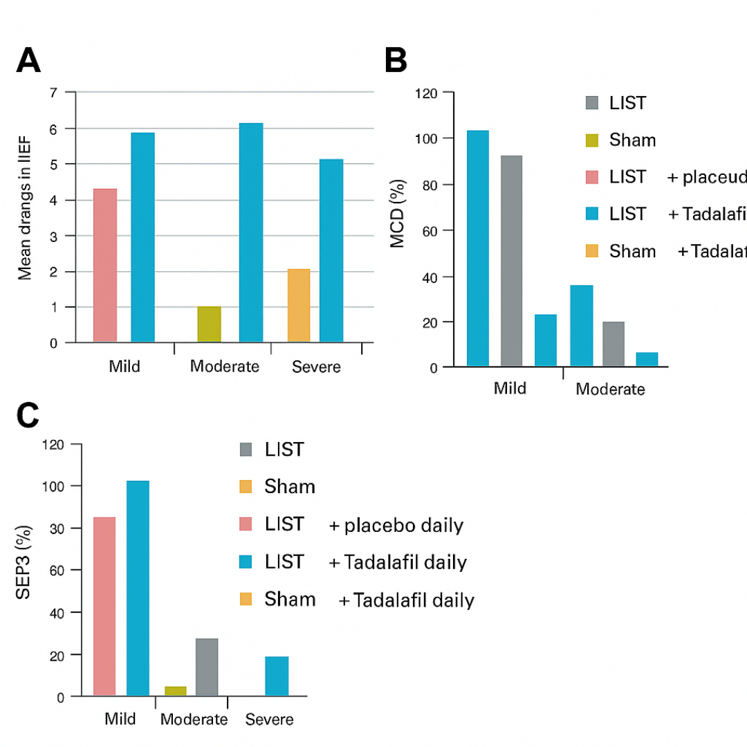 Study conducted by University College London (2022): This study found that patients who received extracorporeal shockwave therapy for 6 weeks showed sustained improvement for up to 12 months after the treatment. The results indicated a significant increase in the elasticity of blood vessels and a notable improvement in penile blood flow. This confirms the ability of shockwave therapy to restore erectile function in men with varying degrees of dysfunction.