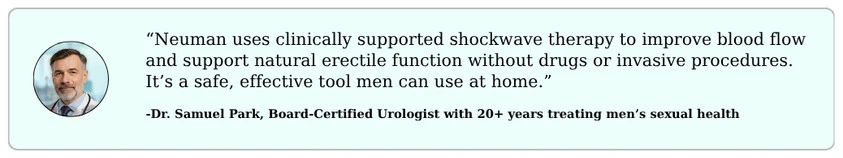 “As a practitioner focused on men’s health, I prioritize solutions that are both effective and practical. Neuman™ stands out for its use of advanced wave therapy—an evidence-based method proven to enhance blood flow and support natural function. What truly sets it apart is the integrated 5-in-1 design, offering targeted glans training, perineum stimulation, muscle engagement, and more in just one sleek, compact device. It’s safe, non-invasive, and perfectly suited for at-home use. I confidently recommend Neuman™ to men looking for a clinically backed, medication-free way to restore performance and confidence without resorting to invasive procedures.”